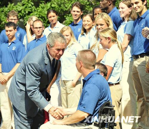 7月21日,美國總統(tǒng)布什在送行儀式上與代表團成員握手。當日,美國總統(tǒng)布什在白宮玫瑰園為美國奧運代表團送行。