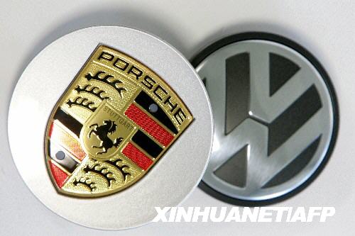 這是2005年9月26日在德國威廉港拍攝的保時捷(左)與大眾的標志。 新華社/法新