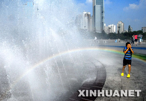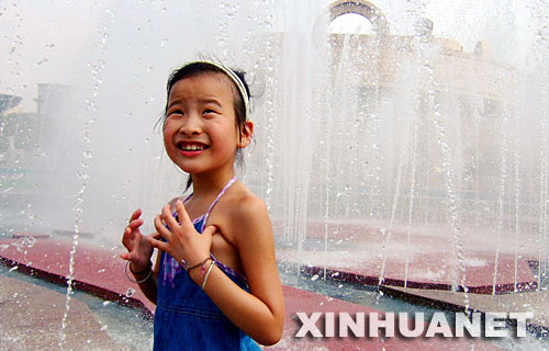 7月24日,一名孩子在上海人民廣場(chǎng)噴水池邊戲水納涼。新華社發(fā)