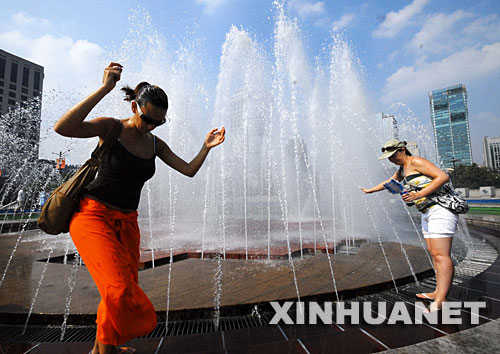 7月24日,兩名外國游客在上海人民廣場(chǎng)噴水池邊戲水納涼。新華社發(fā)