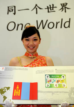 7月29日,一名禮儀小姐在展示蒙古國發(fā)行的奧運(yùn)郵票。當(dāng)日,由中國集郵總公司發(fā)行的《第29屆奧林匹克運(yùn)動會世界郵票大全》第三冊在廣州市亮相?偣菜膬缘脑撪]票大全收集了120多個(gè)國家和地區(qū)的500多枚郵票,目的是向全世界的集郵愛好者推介奧運(yùn)文化。