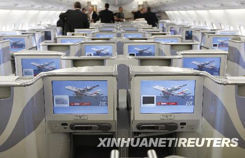 8月1日,在美國紐約肯尼迪國際機場,人們站在首航的阿聯(lián)酋航空公司的空中客車A380客機商務(wù)艙內(nèi)。新華社/路透