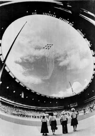 1976年7月17日,蒙特利爾奧運(yùn)會(huì)開幕式上,進(jìn)行空中特技表演的加拿大皇家空軍噴氣式飛機(jī)飛過會(huì)場(chǎng)的環(huán)形屋頂!