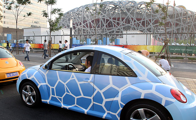 一支充滿“奧運(yùn)中國(guó)”元素的車隊(duì)在“鳥巢”前的道路亮相,吸引了人們的目光。
