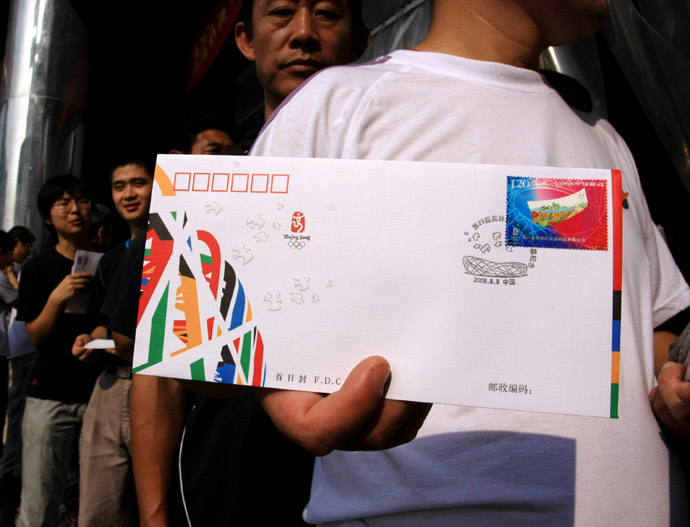 8月8日,合肥市民排隊購買奧運會開幕式相關(guān)郵品。當(dāng)日,《第29屆奧林匹克運動會開幕式》紀(jì)念明信片在全國發(fā)行。此外,《第29屆奧林匹克運動會開幕紀(jì)念》郵票及首日封等同時發(fā)售。