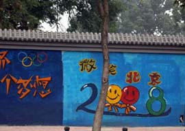 8月7日,人們從北京宣武區(qū)一處“北京奧運(yùn)墻”前經(jīng)過(guò)。該墻長(zhǎng)約300米,畫(huà)著有關(guān)奧運(yùn)內(nèi)容的圖畫(huà),寫(xiě)有祝福北京奧運(yùn)會(huì)的文字。