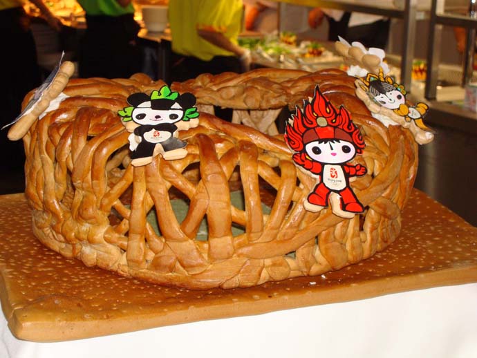 8月8日,北京奧運會媒體村匯園公寓餐廳推出早餐——“鳥巢”面包,以迎接北京奧運會開幕式。