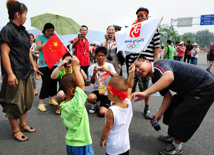 8月8日,游客正在為兩名小男孩拍照。奧林匹克中心區(qū)附近張燈結(jié)彩、彩旗飄揚,來自海內(nèi)外的八方賓客歡聚一堂、喜迎奧運。此刻距北京奧運會開幕還有不到6個小時。