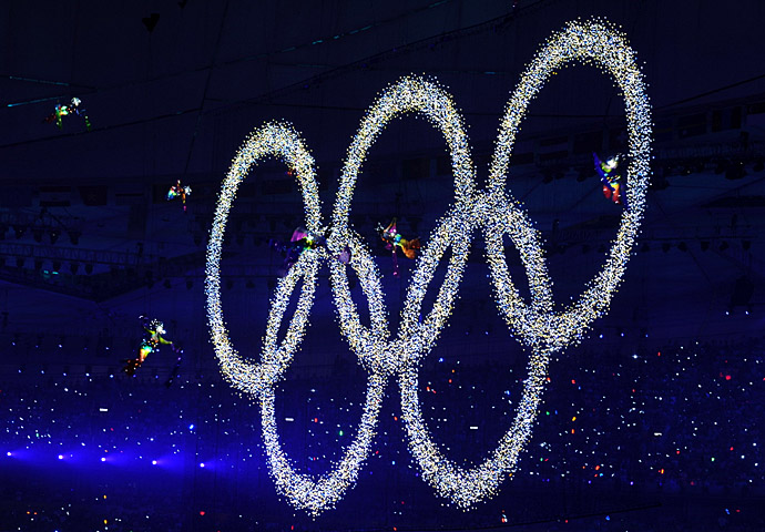 8月8日晚8時,第29屆夏季奧林匹克運動會在國家體育場——“鳥巢”隆重開幕。這是開幕式上閃閃發(fā)光的夢幻五環(huán)出現(xiàn)在“鳥巢”。