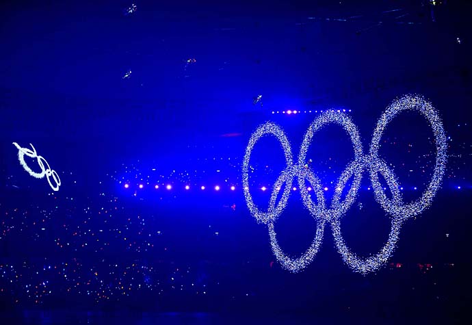 8月8日晚8時(shí),第29屆夏季奧林匹克運(yùn)動(dòng)會(huì)在國家體育場——“鳥巢”隆重開幕。這是開幕式上閃閃發(fā)光的夢幻五環(huán)出現(xiàn)在“鳥巢”。