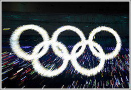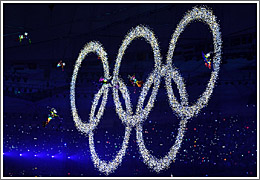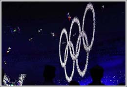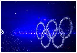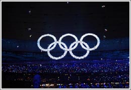 8月8日晚8時(shí),第29屆夏季奧林匹克運(yùn)動(dòng)會(huì)在國(guó)家體育場(chǎng)——“鳥(niǎo)巢”隆重開(kāi)幕。這是開(kāi)幕式上閃閃發(fā)光的夢(mèng)幻五環(huán)出現(xiàn)在“鳥(niǎo)巢”。