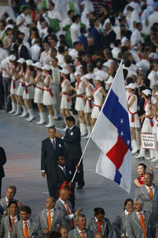 >> 荷屬安的列斯代表團(tuán)在開幕式上入場(chǎng)