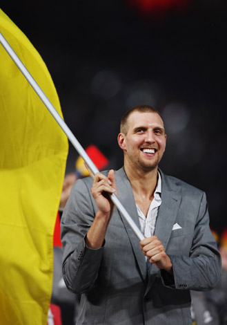 8月8日晚8時,第29屆夏季奧林匹克運動會在國家體育場——“鳥巢”隆重開幕。這是德國代表團(tuán)旗手諾維茨基在開幕式上入場。