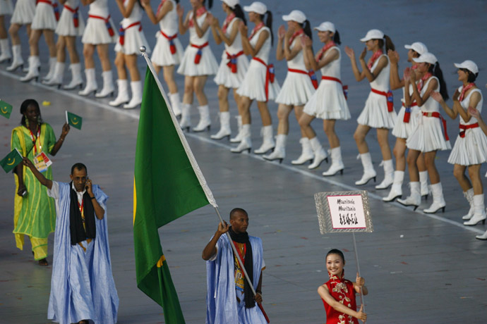 8月8日晚8時(shí),第29屆夏季奧林匹克運(yùn)動會在國家體育場——“鳥巢”隆重開幕。這是毛里塔尼亞代表團(tuán)在開幕式上入場。