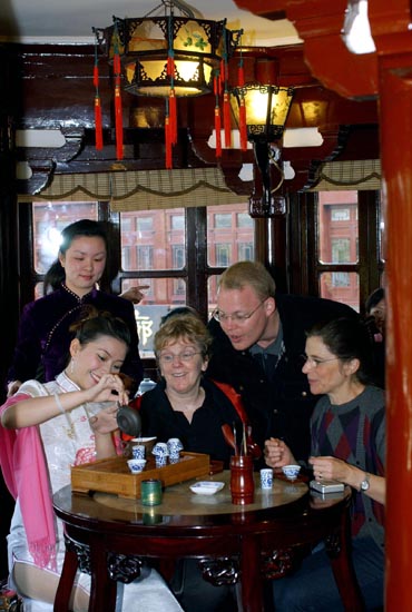 上海旅游形象大使丁曉軍等在“湖心亭”進(jìn)行茶道技藝練兵。新華社發(fā)