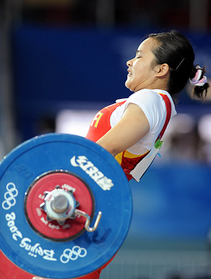 中國(guó)選手陳燮霞在北京奧運(yùn)會(huì)女子48公斤級(jí)舉重比賽中獲得冠軍。