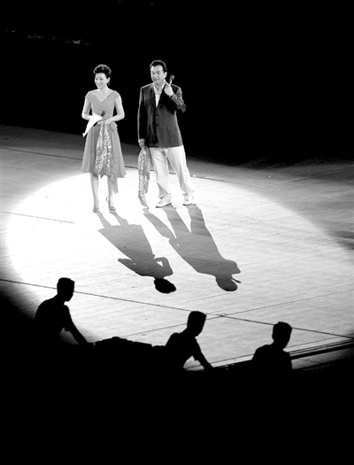 楊瀾和黃宏分在一組,兩人平時只能用電話溝通,“導(dǎo)演選黃宏是因為他在調(diào)動觀眾情緒方面很有經(jīng)驗,我們希望在跟觀眾互動、解釋道具怎么用之外,加一些幽默的成分。比如在帶領(lǐng)全場做鴿子飛翔的動作時,黃宏故意做了一個不優(yōu)美的動作,我就調(diào)侃他不像鴿子,像鴨子。我還對觀眾說練得夠好的話,你們就能飛回家,連機(jī)票都省了。我用英文說的,外國朋友都心領(lǐng)神會”。