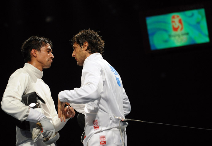 8月10日,委內(nèi)瑞拉選手西爾維奧·費爾南德斯(左)在賽后與匈牙利選手博茨科·加博爾握手。當(dāng)日,在北京奧運會擊劍男子重劍個人1/8決賽中,此前排名世界第一的委內(nèi)瑞拉選手西爾維奧·費爾南德斯負(fù)于匈牙利選手博茨科·加博爾,無緣八強。