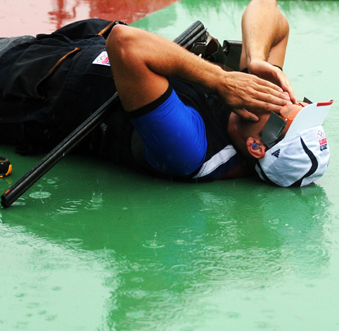 8月10日,捷克選手科斯特萊茨基奪冠后,躺在雨中慶祝勝利。當(dāng)日,在北京射擊場(chǎng)舉行的北京奧運(yùn)會(huì)射擊男子飛碟多向決賽中,科斯特萊茨基奪冠。