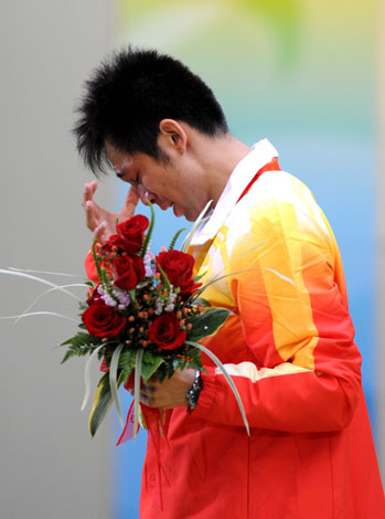 8月11日,中國選手朱啟南在頒獎典禮上擦淚。當(dāng)日,北京奧運會射擊男子10米氣步槍決賽在北京射擊館舉行,中國選手朱啟南以699.7環(huán)的成績獲得亞軍。