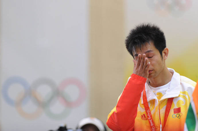 8月11日,中國選手朱啟南在頒獎(jiǎng)典禮上擦淚。當(dāng)日,北京奧運(yùn)會(huì)射擊男子10米氣步槍決賽在北京射擊館舉行,中國選手朱啟南以699.7環(huán)的成績獲得亞軍。