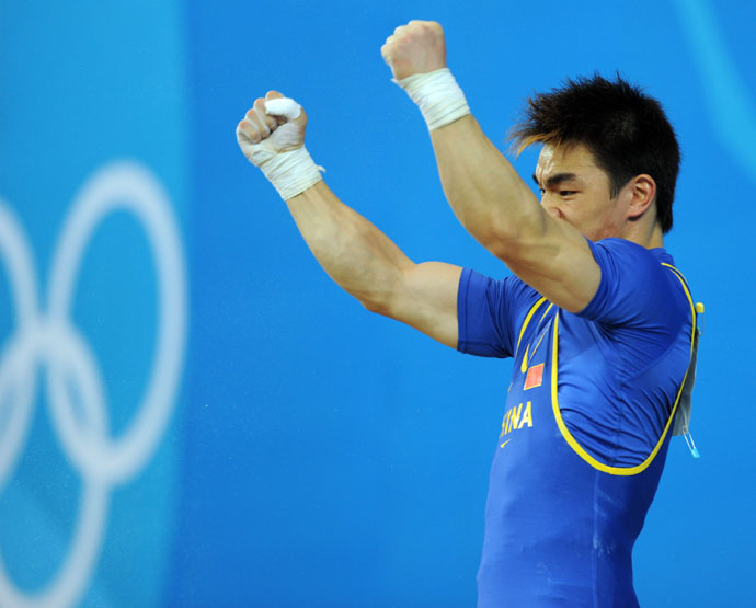 8月12日,中國運動員廖輝慶祝勝利。當(dāng)日,廖輝在北京奧運會舉重男子69公斤級決賽中以348公斤的總成績獲得金牌。