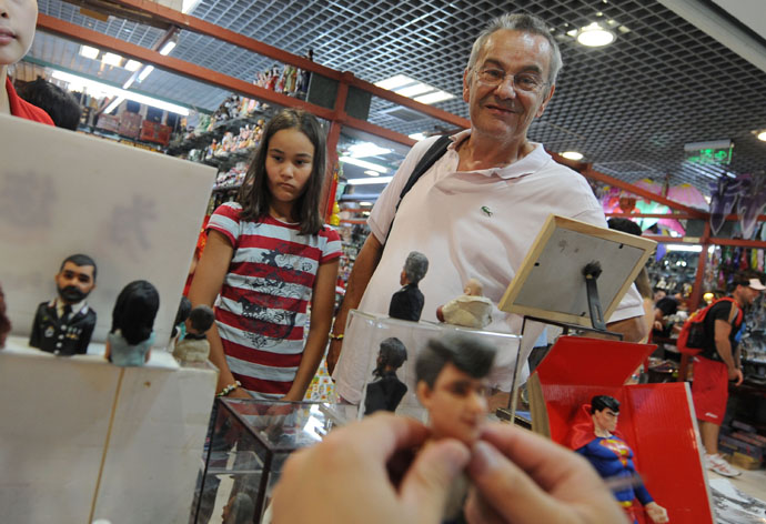 8月13日,一位國(guó)外客人帶著孩子在秀水街面塑攤位前觀賞面塑作品。
