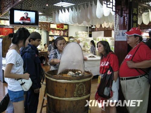 8月14日,幾名外國(guó)游客在北京秀水街觀看絲綢制作工藝。秀水街是中國(guó)改革開(kāi)放以來(lái)北京一處聞名中外的服裝和工藝品市場(chǎng),這里物美價(jià)廉的商品深受國(guó)內(nèi)外游客喜愛(ài),其“絲綢街”的絲綢更是受到外國(guó)游客的青睞。