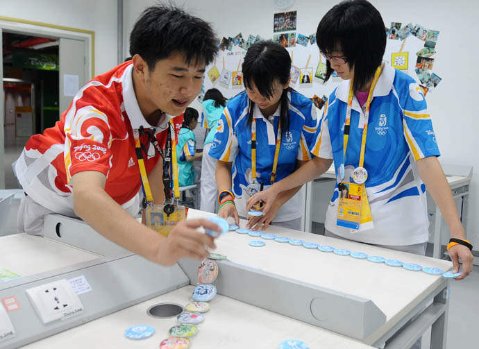 8月12日,參與志愿者崗位標(biāo)識(shí)徽章設(shè)計(jì)的任煒、吳雪楊、于婧(從左至右)等在整理志愿者崗位標(biāo)識(shí)徽章。