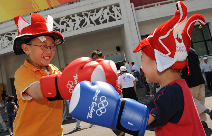 8月15日,兩個(gè)即將觀看北京奧運(yùn)會(huì)拳擊比賽的小朋友,在拳擊比賽場(chǎng)館——工人體育館外戴著拳套玩耍。