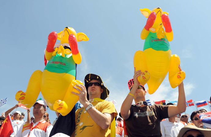8月15日,兩名澳大利亞球迷手舉充氣袋鼠玩具在朝陽公園沙灘排球場為澳大利亞隊(duì)加油。當(dāng)日,澳大利亞隊(duì)娜塔莉·庫克/塔姆辛·巴尼特以2比1戰(zhàn)勝希臘隊(duì)埃夫沙利婭·庫特魯馬尼祖/瑪麗亞·齊亞爾齊亞尼,晉級八強(qiáng)。