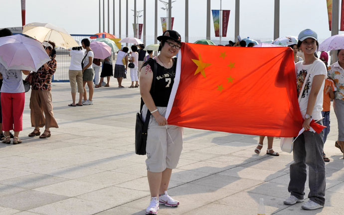 8月15日,兩位青島市民打出五星紅旗為中國運(yùn)動(dòng)員加油。