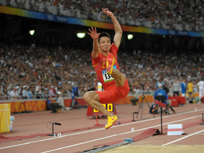 8月16日,中國選手李潤潤在男子跳遠及格賽中。當日,北京奧運會田徑比賽在國家體育場“鳥巢”繼續(xù)進行。