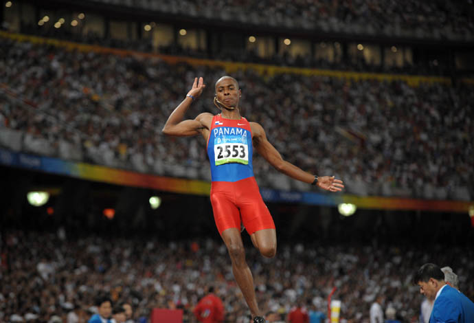 8月16日,巴拿馬選手歐文·哈伊爾·薩拉迪諾·阿蘭達(dá)在男子跳遠(yuǎn)及格賽中。當(dāng)日,北京奧運(yùn)會田徑比賽在國家體育場“鳥巢”繼續(xù)進(jìn)行。