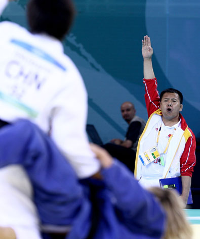8月10日,中國女子柔道運(yùn)動員冼東妹的教練傅國義在比賽現(xiàn)場指導(dǎo)。冼東妹在北京奧運(yùn)會女子柔道52公斤級決賽中戰(zhàn)勝朝鮮選手安琴愛,成功衛(wèi)冕柔道奧運(yùn)會冠軍,創(chuàng)造了中國體育的歷史。