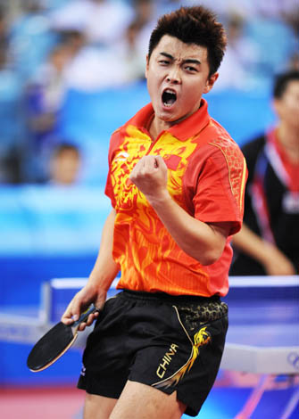 8月16日,中國選手王皓在比賽中慶祝得分。當日,中國隊在北京奧運會乒乓球男團半決賽中以3比0戰(zhàn)勝韓國隊,挺進決賽,將于18日與德國隊爭奪金牌。
