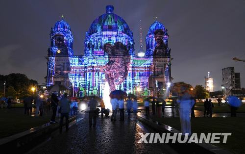 8月15日,行人在被彩燈裝飾的德國(guó)柏林大教堂外駐足。在燈光藝術(shù)節(jié)上,歐洲藝術(shù)家們用彩燈裝飾教堂,吸引了許多觀眾。新華社/法新