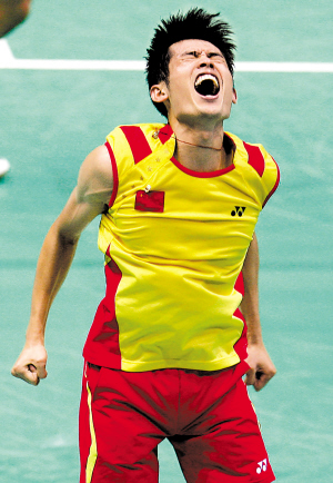 中國選手林丹在慶祝勝利。 新華社記者 張晨