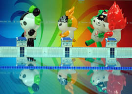 8月17日,福娃為選手助威。當(dāng)日,北京奧運(yùn)會女子3米跳板決賽在國家游泳中心——“水立方”舉行。