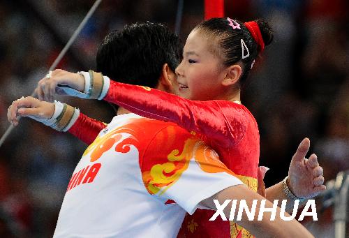 8月18日,中國選手何可欣在完成比賽后與教練擁抱慶祝。當日,在國家體育館進行的北京奧運會體操高低杠決賽中,何可欣以16.725分的成績奪得冠軍。 新華社記者