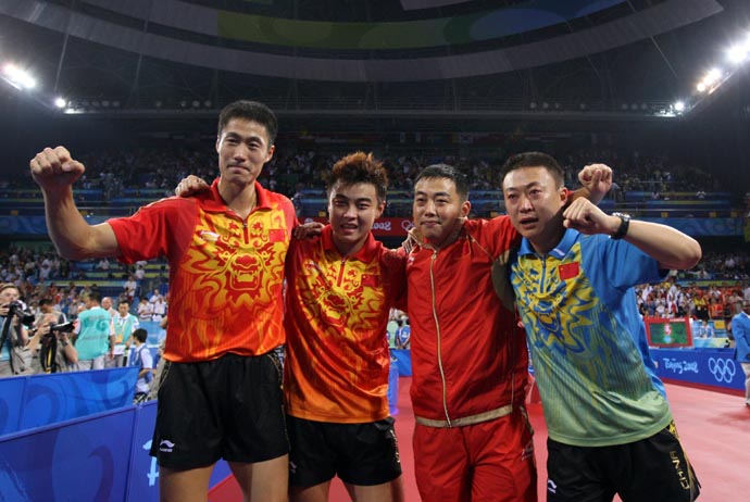 8月18日,中國男隊(duì)主教練劉國梁(右二)、隊(duì)員馬琳(右一)、王皓(左二)、王勵勤賽后合影。當(dāng)日,中國隊(duì)在北京奧運(yùn)會乒乓球男子團(tuán)體決賽中以3比0戰(zhàn)勝德國隊(duì),摘得金牌。
