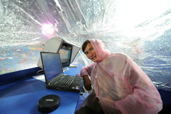 8月18日,新華社哈薩克族攝影記者沙達(dá)提在北京沙灘排球場內(nèi)與美聯(lián)社、法新社等多家媒體一起忙碌地處理圖片。
