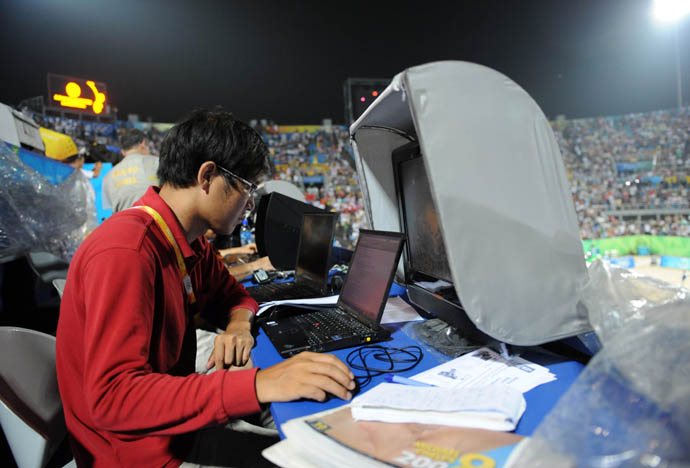 8月18日,新華社記者鄭漢根在北京沙灘排球場內(nèi)忙碌地編寫稿件。