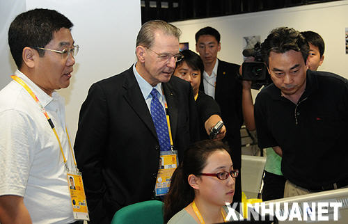 國際奧委會主席羅格(中)14日上午參觀位于北京奧運會主新聞中心的新華社奧運前方報道團,圖為新華社副總編輯彭樹杰(右)向羅格介紹新華社奧運報道情況。新華網(wǎng)記者 胡孝乾