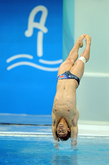8月19日,中國選手何沖在比賽中。當(dāng)日,北京奧運(yùn)會(huì)跳水比賽在國家游泳中心——“水立方”繼續(xù)進(jìn)行,何沖在男子3米跳板決賽中獲得冠軍。