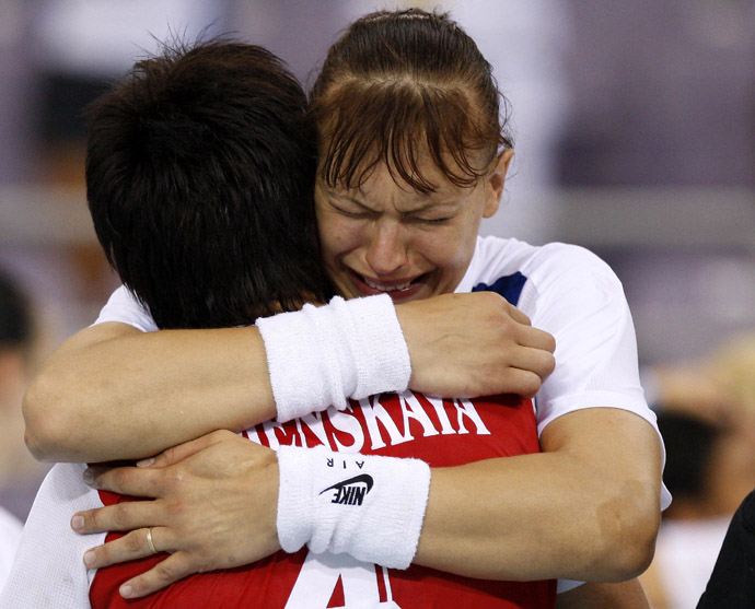 8月19日,俄羅斯隊球員葉連娜·波列諾娃在賽后喜極而泣。當日,在北京奧體中心體育館舉行的北京奧運會女子手球四分之一決賽中,經(jīng)過兩場加時賽,俄羅斯隊以32比31戰(zhàn)勝法國隊,晉級四強。