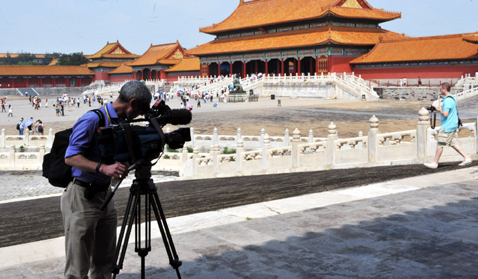 8月19日,一位來自美國的電視記者在故宮采訪拍攝。北京奧運(yùn)會(huì)期間,眾多外國游客來到北京故宮參觀游覽,了解和感受中國文化。