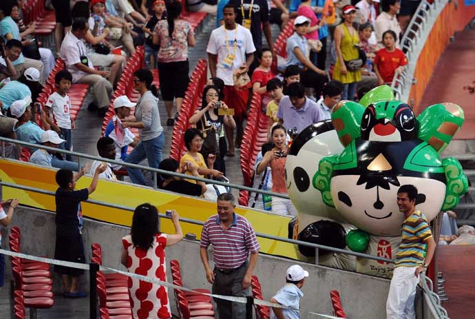8月19日,熱情的觀眾紛紛與福娃合影留念。北京奧運(yùn)會(huì)田徑比賽在國家體育場(chǎng)漸入高潮,前來“鳥巢”觀賽的觀眾們更是熱情高漲。