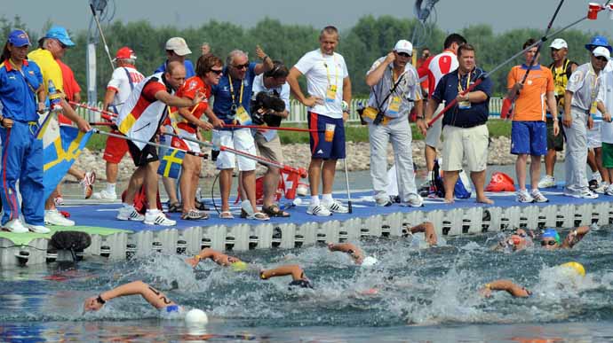 各隊(duì)教練正在為參加女子10公里馬拉松游泳比賽的運(yùn)動員們補(bǔ)充能量。