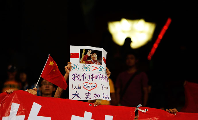 8月20日,北京奧運(yùn)會(huì)田徑比賽在國(guó)家體育場(chǎng)“鳥(niǎo)巢”繼續(xù)進(jìn)行。圖為比賽中觀眾打出的標(biāo)語(yǔ)。